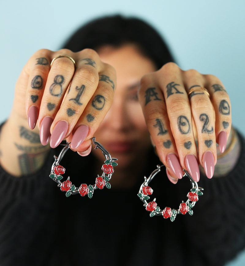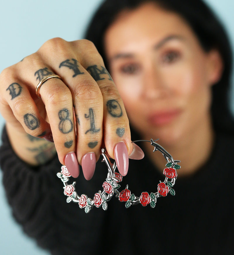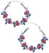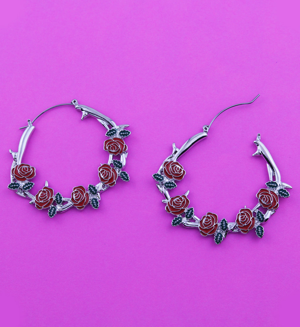 Plug hoops with a red and green enamel filled design consisting of a thorny vine with multiple rose blossoms. They are 20G and made from 316L stainless steel with a 316L stainless steel post. These styles are made to fit in any eyelet/tunnel style of plugs but can also be worn in normal ear piercings. Dimension: 50mm (L) x 55mm (W). Sold in pairs (2 pcs).