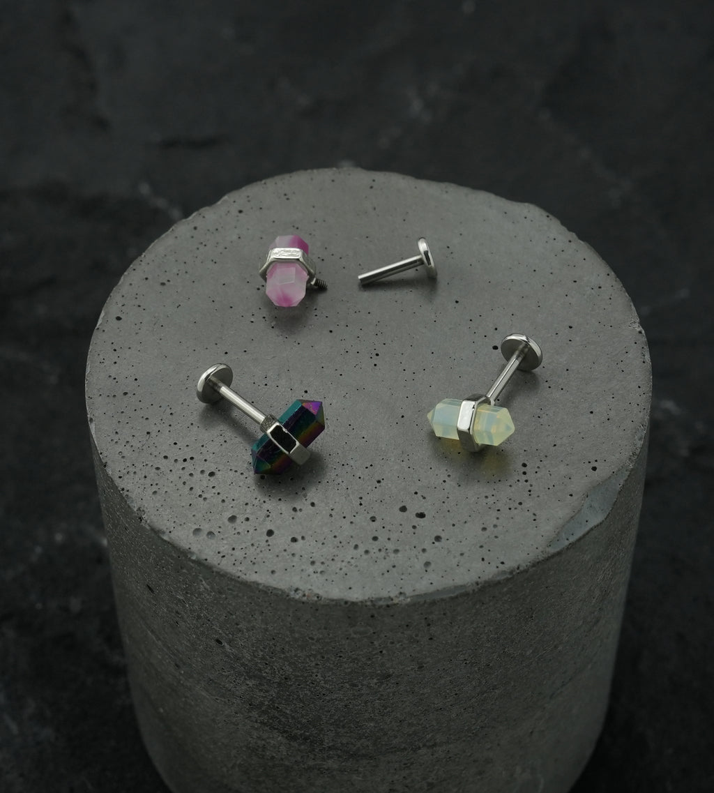 Internally threaded labret that consists of a white resin crystal on top of a labret piece. Size is 18G. Made from 316L stainless steel. Length is 1/4" (6mm). Sold individually (1pc). Also available in blue rainbow aurora and pink crystal.