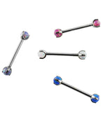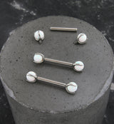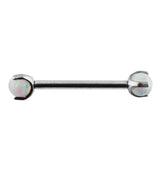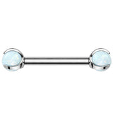 Subtly show off with our white opalite claw barbell! The 14g straight barbell is constructed from ASTM F-136 titanium with 1/2" (12mm) wearable area and features sturdy internal threading with 4mm balls. Sculpted claw ends and white opalite accents offer creative shine for any look! Sold individually, order two for a pair.