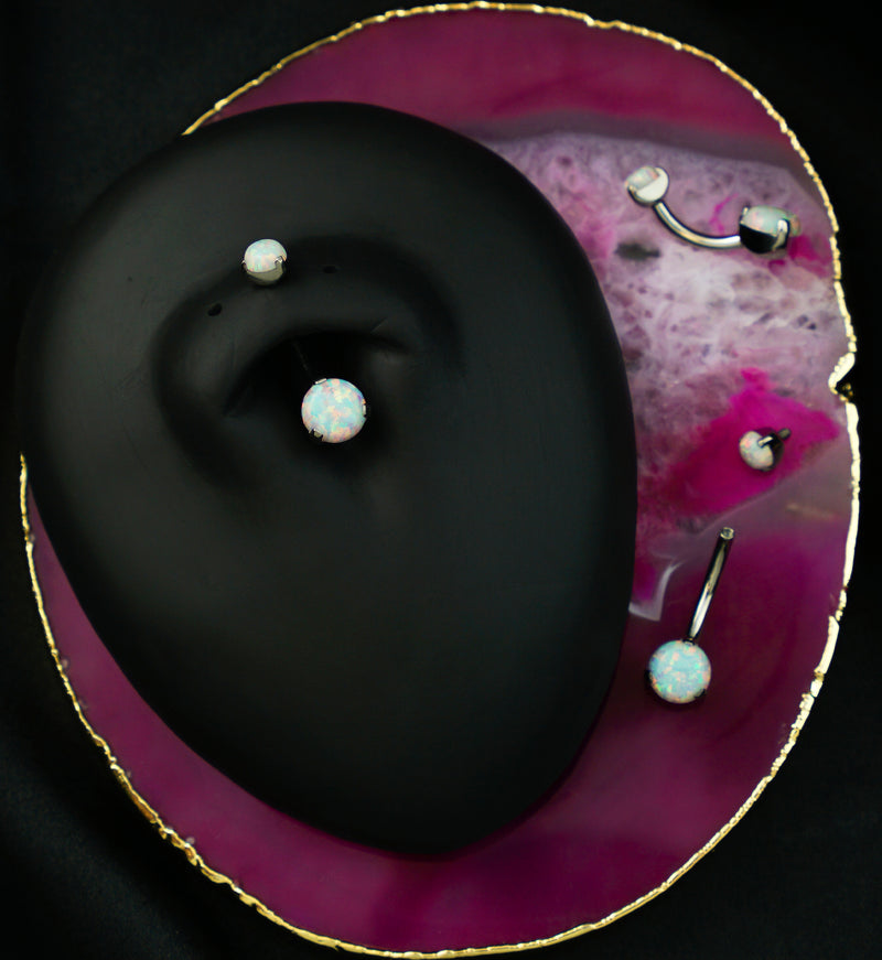 This three-prong set navel ring is made of durable ASTM F-136 titanium, ensuring strength for your piercing. Its synthetic white opal gems add a touch of shimmer and its internally threaded style is easy to insert and take out. Size is 14G with a wearable length of either 5/16" (8mm) or 3/8" (10mm). Available in gem sizes 4mm x 6mm. Sold individually.