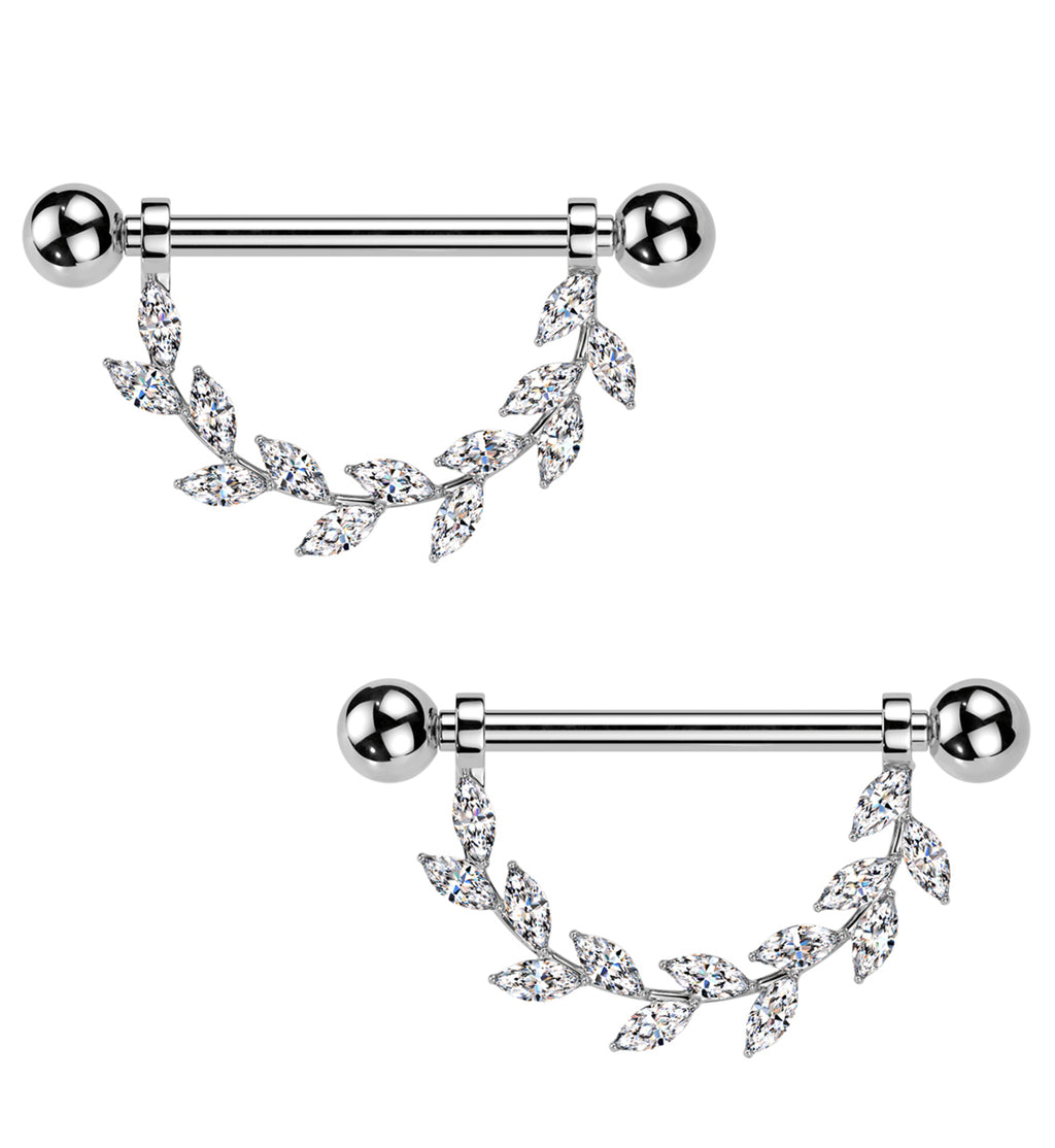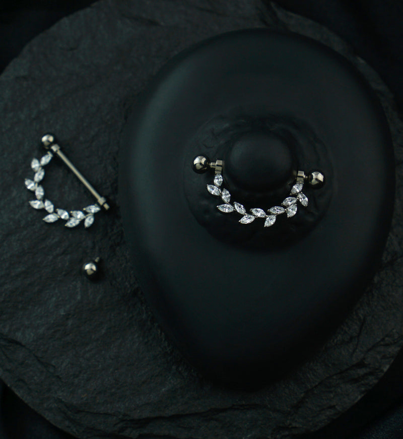 Add some sparkle with our Wreath Clear CZ Internally Threaded Titanium Nipple Barbells. Sold in pairs, these barbells are 14G with a wearable length of 9/16" (14mm). The ball ends are internally threaded and measure about 4mm each. The ASTM F-136 titanium implant grade material ensures both quality and safety, while the clear marquise CZ gems wrap under the nipple for a beautiful accent. Sold in pairs.